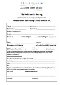 Füllen Sie einfach den Mitgliedsantrag aus und senden Sie Ihn per Post an den Förderverein, oder geben ihn im Sekretariat der Georg-Kropp-Schule ab.